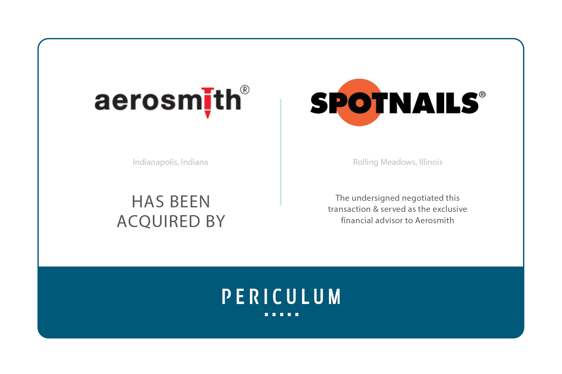 “We can’t thank the Periculum team enough for their expertise, advocacy, and commitment to finding the right buyer for our Company. Their leadership and tenacity in executing this transaction in the face of a challenging economic backdrop confirms their reputation as a true investment banking partner to business owners” said Doug Hahn, board member and shareholder of HKN International. “Throughout our merger with Spotnails, Periculum provided the rigorous discipline to process and expert guidance that was essential to our success. Their steady hand ensured every detail was managed with precision, allowing our leadership to focus on a seamless transition for our staff as we join the new organization. We are grateful for a partner that prioritizes both technical excellence and the long-term stability of our team,” added Spencer Jessee, President of Aerosmith.