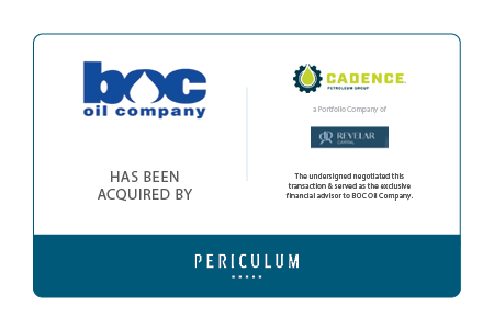 Periculum Capital Company, LLC (“Periculum”) is pleased to announce that it served as the exclusive financial adviser to BOC Oil, Inc (“BOC Oil” or the “Company”), a North Charleston, South Carolina based tank wagon distributor of diesel fuel, gasoline, and diesel exhaust fluid (“DEF”) in its sale to Cadence Petroleum Group (“Cadence”), backed by Revelar Capital (formerly known as Wellspring Capital Management, “Revelar”)